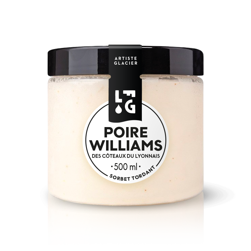 Ce sorbet est constitué de 80% de poire Williams, une variété ultra juteuse comportant une pointe d’acidité.